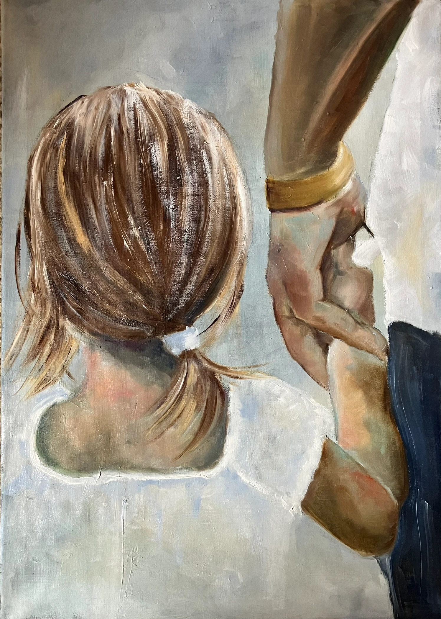 Wolff’s use of rich, impasto texture transforms the canvas into an emotional landscape. The warm, earthy tones are a loving embrace, while the soft, dreamlike background creates an ethereal space where time stands still. The painting isn’t about faces or places; it’s about the deep, unwavering bond that exists in the simplest of touches.