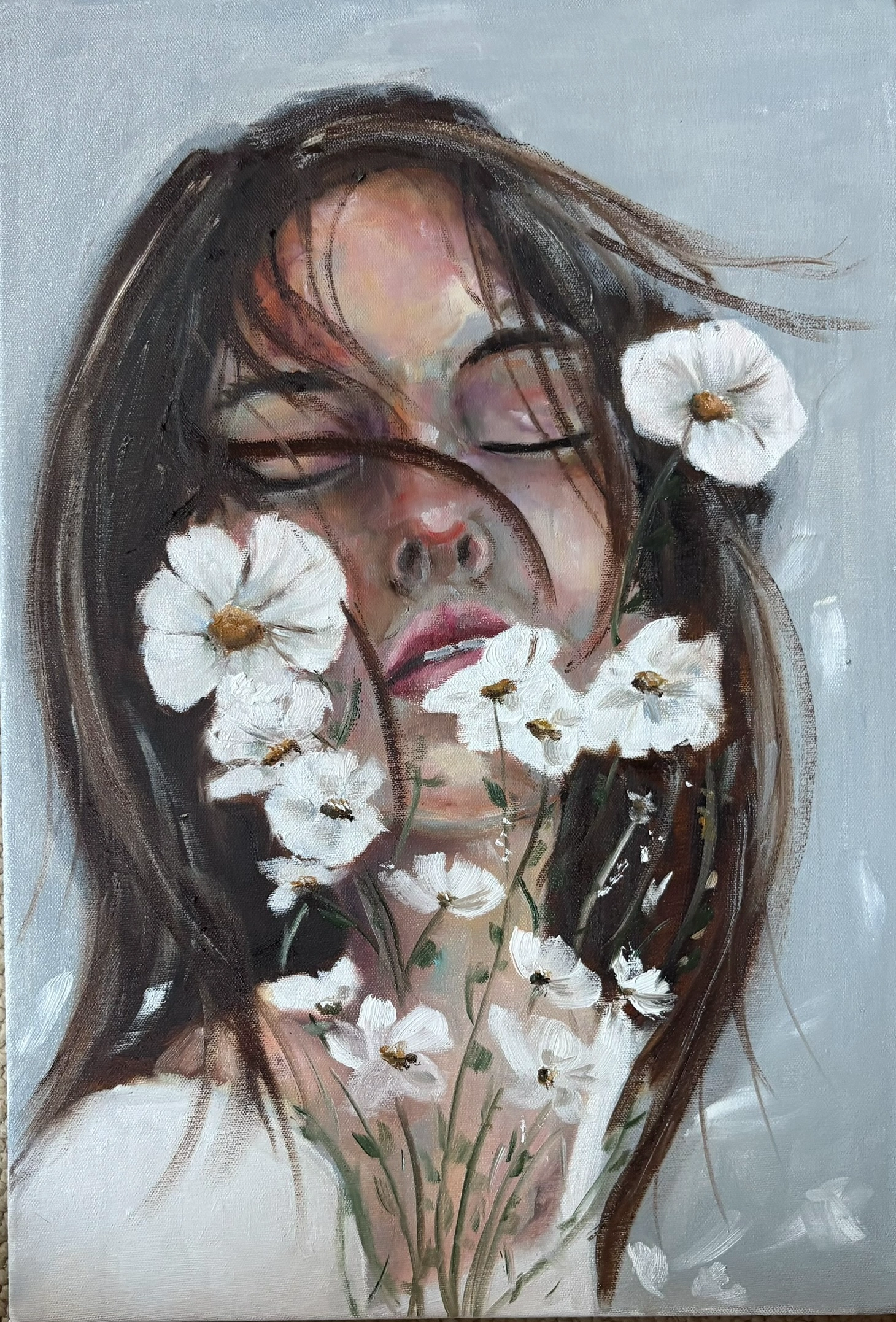 These blossoms aren’t just an adornment; they are an extension of the subject’s essence, symbolising purity, fragility, and the blooming spirit. The soft, atmospheric background enhances the feeling of tranquillity, allowing the poignant beauty of the central imagery to truly flourish.
