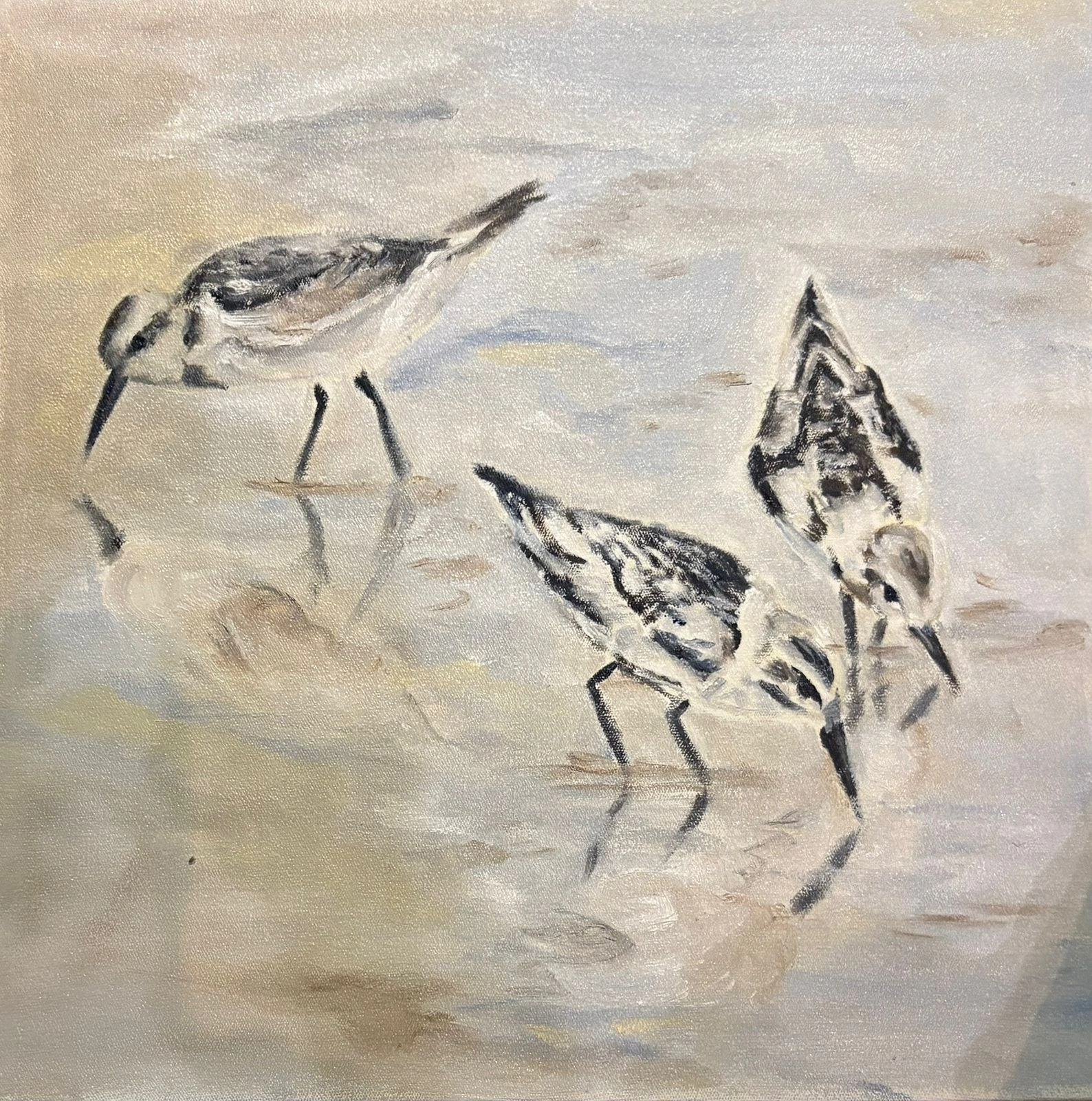 The wet sand is depicted as a mirror, a shimmering surface that duplicates the bird’s forms and the faint colours of the sky above, creating a serene, almost impressionistic dance of light and shadow.