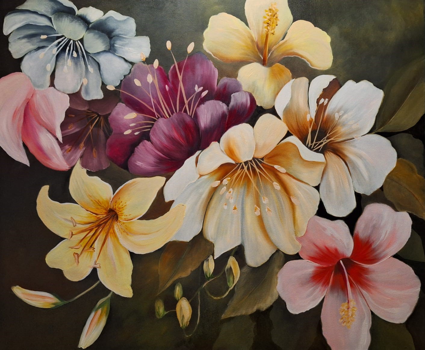 Michael Heyns Riveting Rose Duiwe En Groot Wit Blom Oil Painting 150 x 80cm