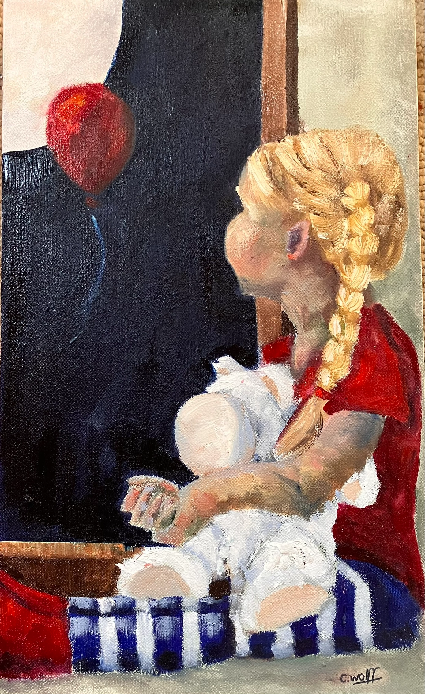 The central figure is a young girl, her back to a window, holding a doll. The girl’s form is a study in peaceful innocence, with her hair braided down her back and her clothes rendered in a vibrant palette of red and blue. The light from the window casts a gentle glow on her, highlighting her serene expression.