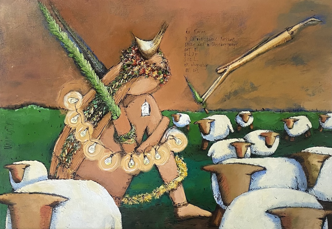 Hanlie Kotze started writing poetry at school and was always fascinated by the interpolation of what could be called word art and her visual art, now increasingly moving to acrylics from water colours. Her work is a mixture between surrealistically naive and expressionistic art, perhaps best described as almost lyrical, and she favours symbolism in all her paintings to blend with poetry.