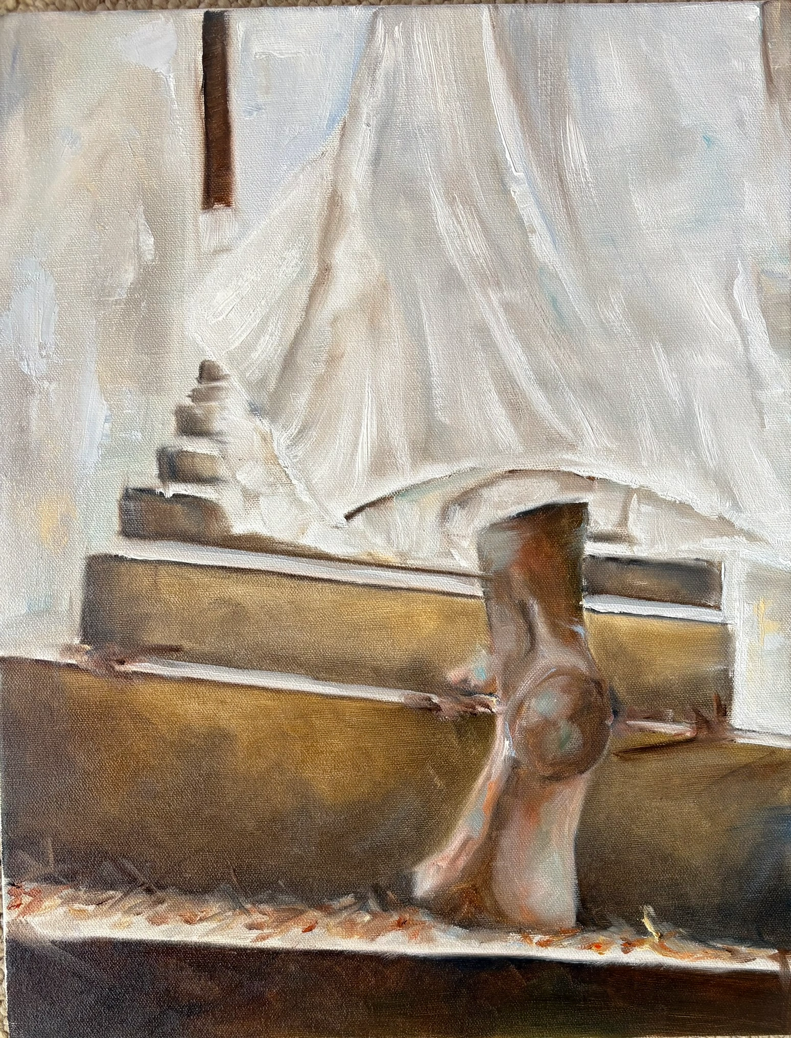 The rich, textured impasto paint on the boots and the steps gives the piece a wonderful, tactile depth, grounding the ethereal quality of the cloth.