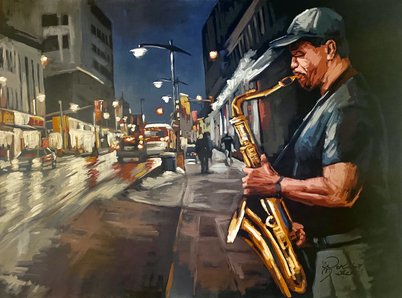 Wakaba Mutheki Savvy Sax In Street Scene Acrylic Painting 120 x 90cm