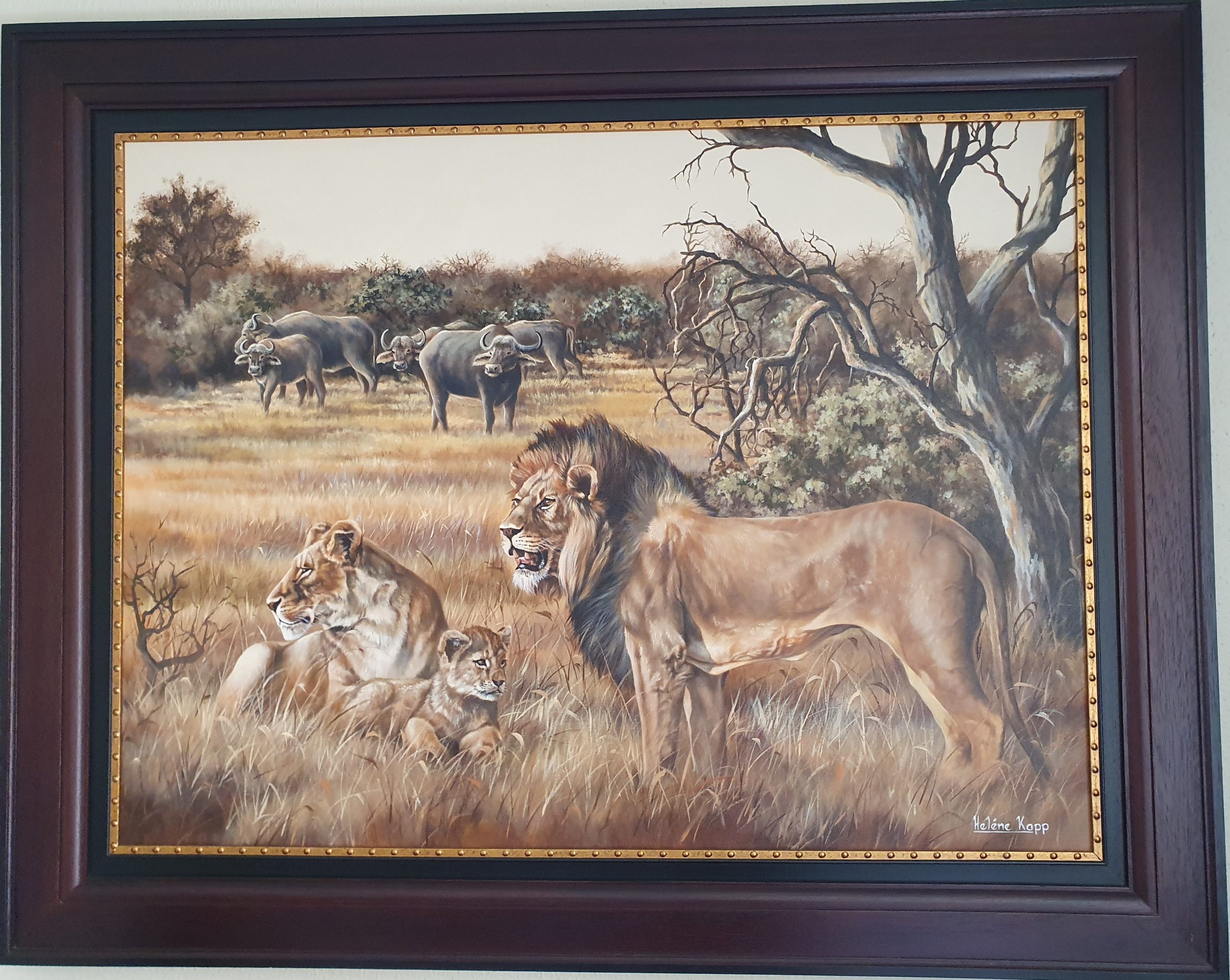 Kapp’s fascination with African wildlife began at a young age when she spent much of her childhood in the African bush. Her love for nature and animals is evident in her paintings, which are filled with vibrant colours and intricate details. She uses oil paints to capture the texture of the animals’ fur, the play of light and shadow on the grass, and the magnificent African skies.